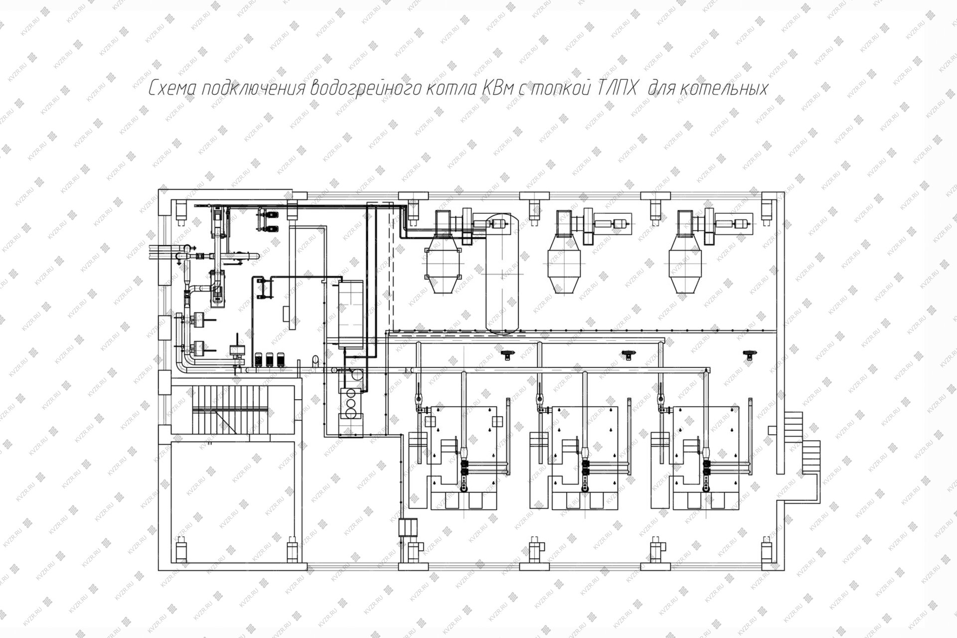 К вспомогательному оборудованию при подключении промышленного водогрейного котла КВм с ТЛПХ относят - щит управления котлом, насос циркуляционный, насос подпиточной воды, бак запаса воды, расширительный мембранный бак, транспортеры, дымовую трубу, систему газоходов и дымосос, золоуловитель (по желанию).