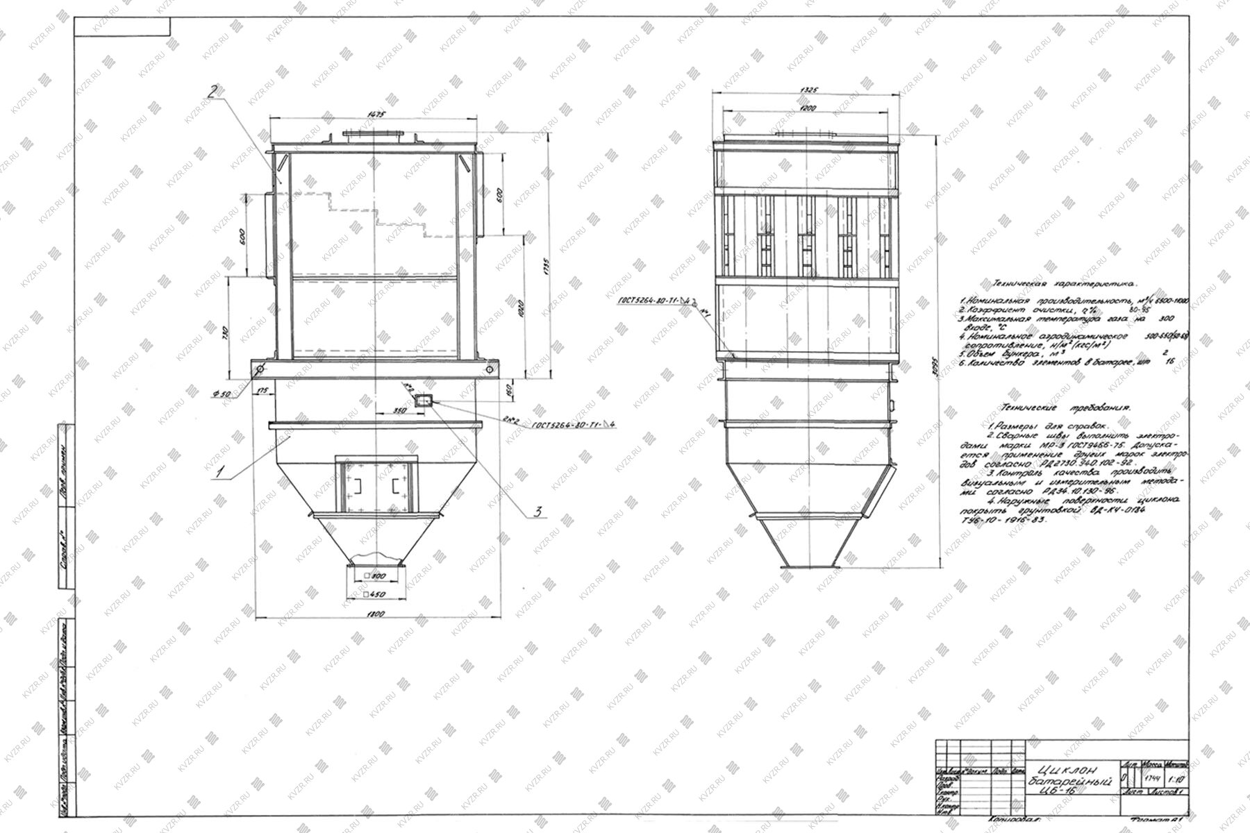 Бункеры имеют пирамидальные форму. Аппарат группового исполнения изготовляют с "левым" и "правым" вращением газового потока, одиночные - только с "правым" вращением.