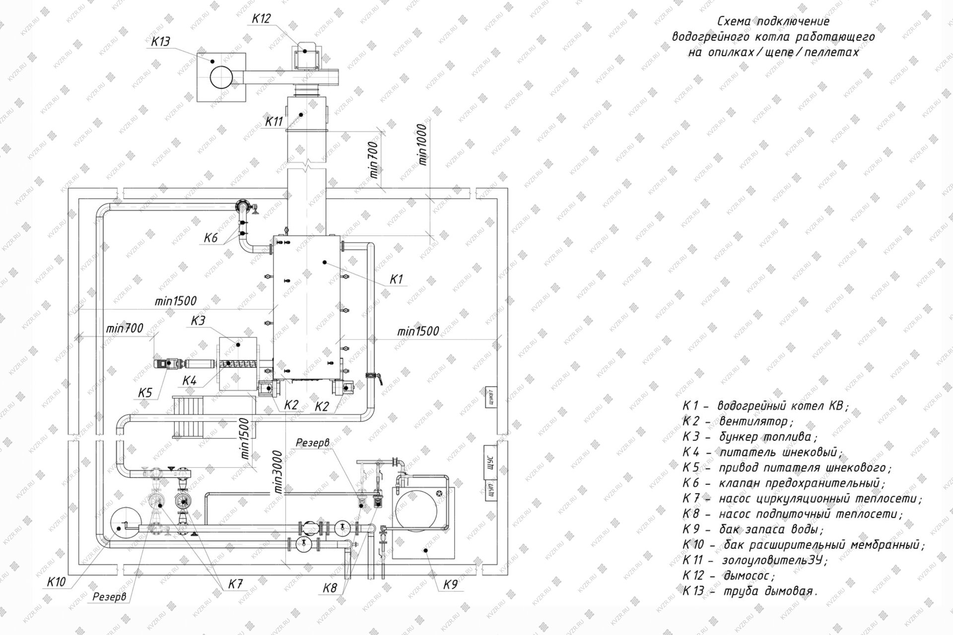 Чтобы правильно подключить пеллетный котел 0.5 МВт в котельной необходимо оставить проемы для обслуживания оборудования во время эксплуатации. На представленной здесь схеме указаны их минимальные размеры. Кроме того, в данной примерной схеме монтажа водогрейных котлов и оборудования указан перечень минимально необходимого вспомогательного оборудования для правильной работы котла.