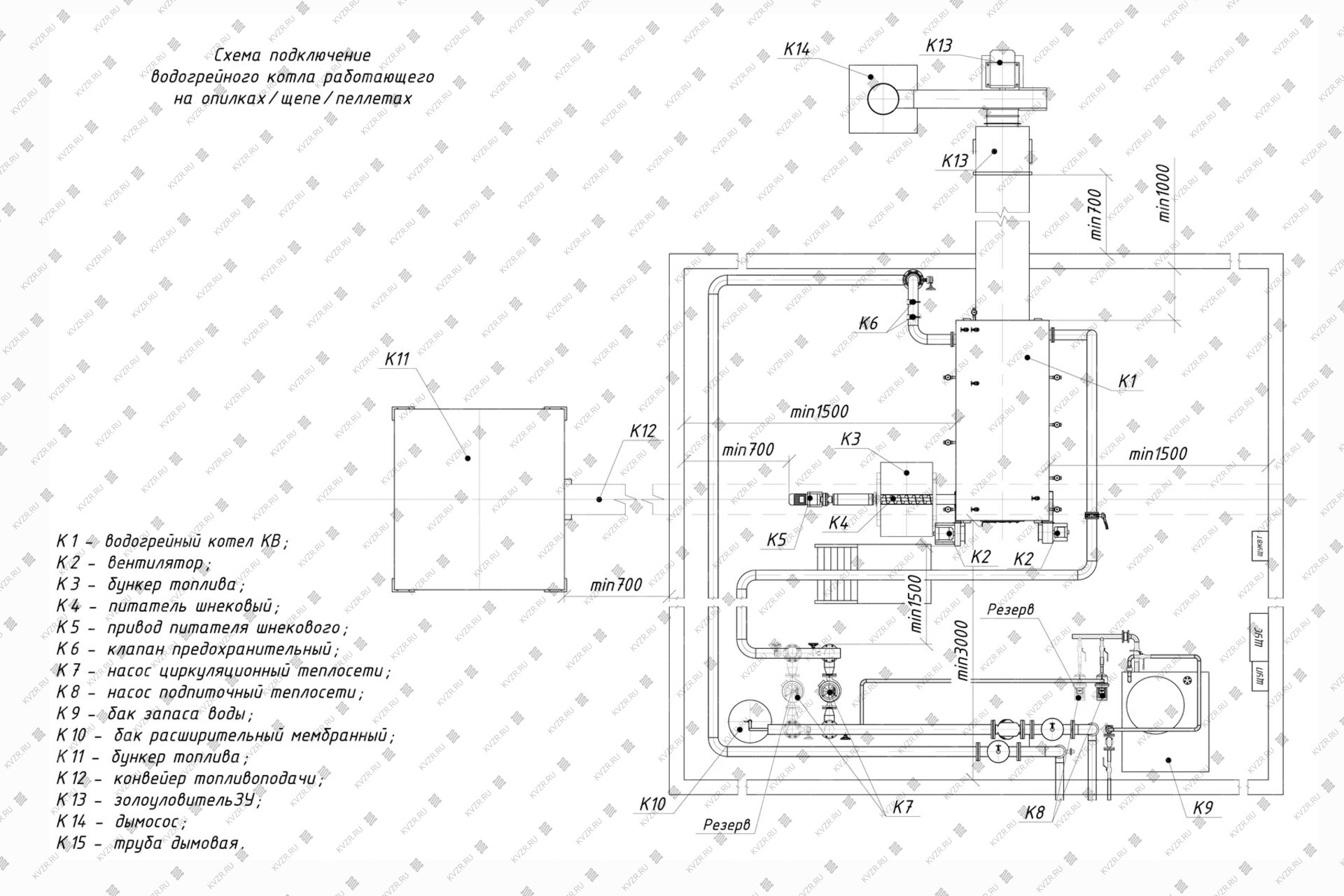 Чтобы правильно подключить котел 0.2 МВт на опилках в котельной необходимо оставить проемы для обслуживания оборудования во время эксплуатации. На представленной здесь схеме указаны их минимальные размеры. Кроме того, в данной примерной схеме монтажа водогрейных котлов и оборудования указан перечень минимально необходимого вспомогательного оборудования для правильной работы котла.
